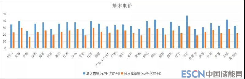 基本電價(jià)只有大工業(yè)用戶收取,分按最大需量和按變壓器容量收取。從基本電價(jià)的情況來看,按最大需量平均為35.1元/千瓦˙月,按變壓器容量平均約為24.4元/千瓦˙月,北京最高,天津最低。