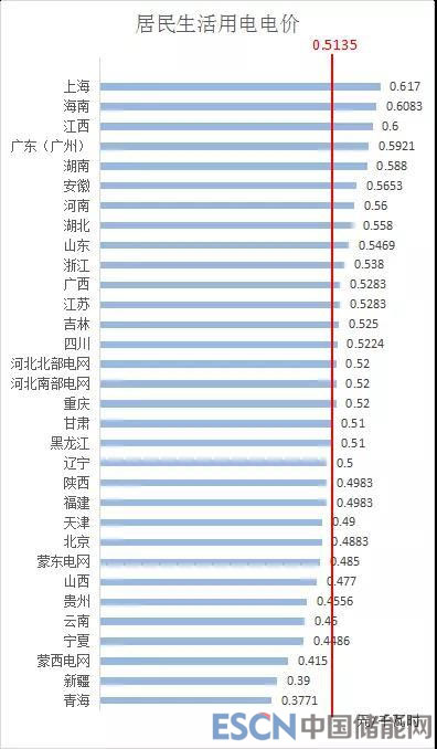 據(jù)公開電價(jià)信息的不完全統(tǒng)計(jì),全國居民生活用電平均電價(jià)約為0.5135元/千瓦時(shí),其中,上海最高為0.617元/千瓦時(shí),青海最低為0.3771元/千瓦時(shí)。