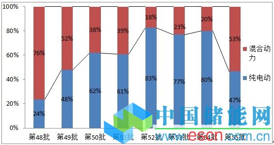 記者梳理最近八批的工信部《節(jié)能與新能源汽車示范推廣應(yīng)用工程推薦車型目錄》,也進(jìn)一步佐證了上述觀點(diǎn),國(guó)內(nèi)車企新能源汽車的車型開(kāi)發(fā)主集中在純電動(dòng)汽車方面(備注:第55批目錄中混合動(dòng)力占比超50%,主要是企業(yè)預(yù)期混合動(dòng)力客車補(bǔ)貼政策將出,金龍客車、廣汽集團(tuán)等車企集中上報(bào)混合動(dòng)力客車車型引起)。
