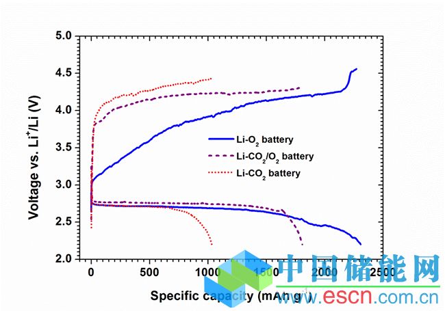 圖2: Li/O2 電池、Li/CO2:O2 (2:1) 電池和Li/CO2 電池的首次充放電曲線對(duì)比。圖中正極為KB和PTFE(重量比90:10),電解液為LiCF3SO3-TEGDME,負(fù)極為鋰,工作溫度為室溫。
