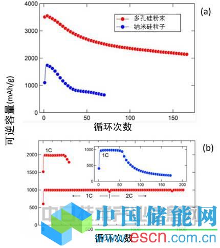 定容量充放電試驗(yàn)是在電位窗中(0~1.0V)反復(fù)充放電至2000mAh/g或1000mAh/g的定容量,充電速度設(shè)定為定電流充放電試驗(yàn)時(shí)的2倍,即1C。結(jié)果顯示,在容量設(shè)定為2000mAh/g的試驗(yàn)中,使用多孔硅粉末時(shí)性能保持在220次循環(huán),而使用硅納米粒子時(shí)則不能充電。容量設(shè)定為1000mAh/g(以往碳類材料的2.7倍)時(shí),使用硅納米硅粒子時(shí)的性能只能保持到約50次循環(huán),而使用多孔硅粉末時(shí),即使在721次循環(huán)后將充電速度加快至2C,性能仍可保持在1500次循環(huán)以上。此外還確認(rèn),使用多孔硅粉末時(shí),充電速度加快至最大4C時(shí)也可充電。估計(jì)這是因?yàn)槎嗫坠璧谋缺砻娣e大。