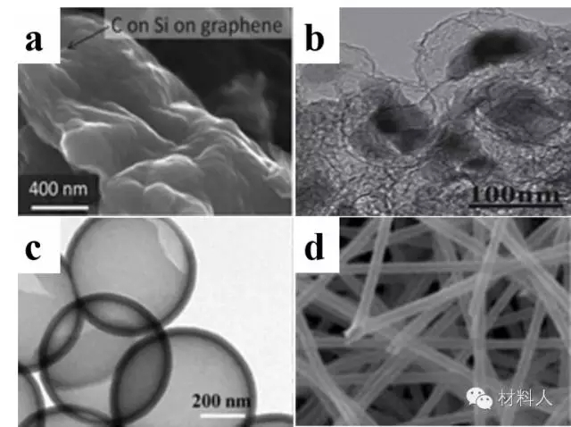 圖4.Si-C復(fù)合材料:(a)碳包覆Si顆粒與石墨烯復(fù)合材料;(b)Si-C空心球復(fù)合材料和中空Si電極材料(c)Si空心球和(d)Si空心管