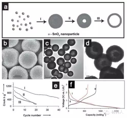 圖5(a)SnO2空心球形成示意圖:通過(guò)從內(nèi)到外的奧斯瓦爾德熟化(b)和(c)SnO2是空心球(d)a-Fe2O3@SnO2鈴鐺狀(e)循環(huán)圖(f)空心球的第一圈的充放電曲線