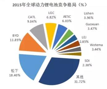 隨著新能源汽車行業(yè)的蓬勃發(fā)展,從2010年開始全球動(dòng)力鋰電池市場(chǎng)呈現(xiàn)高速增長(zhǎng)態(tài)勢(shì),到2015年全球動(dòng)力鋰電池市場(chǎng)規(guī)模達(dá)631億元。就市場(chǎng)集中度而言,前十家鋰電池企業(yè)的動(dòng)力鋰電池業(yè)務(wù)占據(jù)了全球動(dòng)力鋰電池市場(chǎng)的68.28%,包含了5家國(guó)內(nèi)鋰電池企業(yè)。從具體企業(yè)市場(chǎng)規(guī)模來看,主供特斯拉的松下占據(jù)了全球動(dòng)力鋰電池市場(chǎng)的近兩成,BYD依托于自身新能源汽車業(yè)務(wù)的快速發(fā)展,成為僅次于了松下的動(dòng)力鋰電池供應(yīng)巨頭,占據(jù)全球動(dòng)力鋰電池市場(chǎng)的11.89%,但是比亞迪動(dòng)力鋰電池僅對(duì)內(nèi)供應(yīng)。