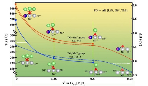 理論計(jì)算和實(shí)驗(yàn)測量得到三元層狀材料充電(脫鋰)過程中起始脫氧溫度的變化
