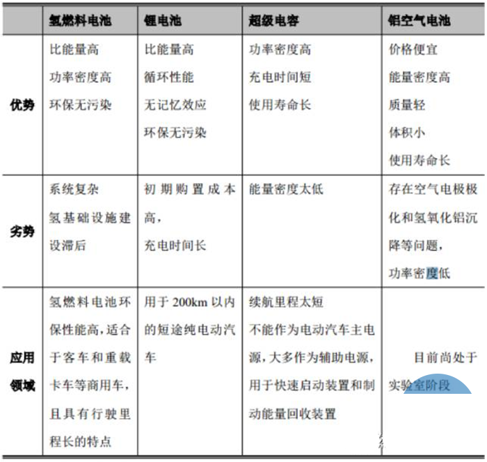 目前在交通運(yùn)輸用動(dòng)力源方面,主要有四種技術(shù)路線:鋰離子電池、氫燃料電池、超級(jí)電容和鋁空氣電池。其中鋰離子電池、超級(jí)電容和氫燃料電池得到廣泛的應(yīng)用,而鋁空氣電池尚處于實(shí)驗(yàn)室研究階段。能源補(bǔ)給方面,鋰離子電池、超級(jí)電容適用于純電動(dòng)汽車(chē),但是需要外部充電,而氫燃料電池汽車(chē)則需要外部氫氣加注,鋁空氣電池則需要補(bǔ)充鋁板和電解液。就目前來(lái)看,鋰離子電池在未來(lái)相當(dāng)長(zhǎng)的一段時(shí)間內(nèi)還是要占據(jù)主要發(fā)展空間的。