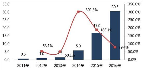圖 2011-2016年中國鋰動力電池出貨量:Gwh