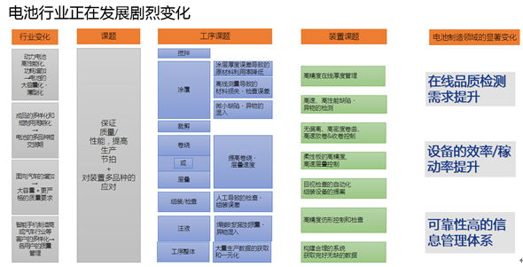 與此同時,電池行業(yè)的發(fā)展需求也出現(xiàn)了顯著的變化,不論是智能手機領(lǐng)域?qū)τ诳焖俪潆姾痛笕萘侩姵氐淖非螅€是新能源汽車對于高容量以及安全性的需求,都為電池行業(yè)帶來了巨大的挑戰(zhàn),電池制造的革新將從以往的自動化效率的提升轉(zhuǎn)向效率和品質(zhì)并重的階段。