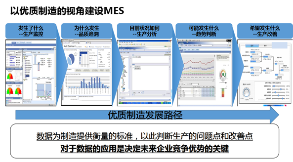 因此實現(xiàn)優(yōu)質(zhì)制造的基礎(chǔ)是實施MES系統(tǒng)。通過實施MES系統(tǒng)來解決數(shù)據(jù)如何采集和標準化、數(shù)據(jù)如何篩選,甄別和統(tǒng)計,形成有效的信息、以及如何對于信息進行分析和判斷,并以此產(chǎn)生價值。