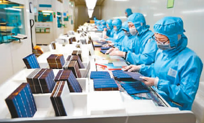 圖為中國工人在車間內(nèi)分選電池片。