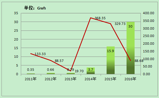 圖 1 2011-2016年中國鋰動力電池出貨量:Gwh