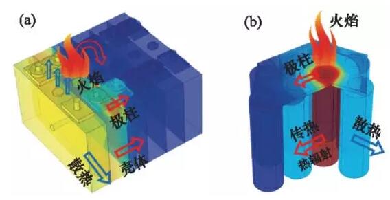 熱失控觸發(fā)后,局部單體熱失控后釋放的熱量向周圍傳播,將可能加熱周圍電池并造成周圍電池的熱失控,從而發(fā)生鏈式反應造成極大的危害。