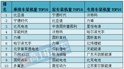 分領(lǐng)域看,在乘用車、客車和專用車領(lǐng)域裝機(jī)量居于首位的動(dòng)力電池企業(yè)分別為比亞迪、寧德時(shí)代與沃特瑪。此外,力神、星恒電源、中信國安盟固利、哈爾濱光宇、億緯鋰能、中航鋰電、國能電池、微宏動(dòng)力、廣東天勁、孚能科技、珠海銀隆、江蘇索爾、均等知名電池企業(yè)均憑借良好的成績出現(xiàn)在前十位的排名榜中。