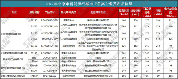 北京市場(chǎng)是全國(guó)新能源汽車推廣的重要陣地,也是全國(guó)新能源汽車發(fā)展的一個(gè)風(fēng)向標(biāo)。從北京市新能源汽車目錄公示信息我們可以知道,2017年,寧德時(shí)代、比亞迪、孚能科技(贛州)這些電池企業(yè)的產(chǎn)品在北京市場(chǎng)占有重要分量,磷酸鐵鋰和三元電池在新能源乘用車中也占據(jù)大半壁江山;電池能量密度超過(guò)120Wh/kg的并不多,續(xù)駛里程、百公里耗電等指標(biāo)均比往年有所提高。