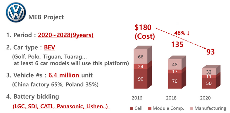 相比于102USD/kWh的成本,VW的成本目標(biāo)更為激進(jìn)。從2020到2028年,VW計(jì)劃發(fā)布至少6款基于MEB平臺(tái)的電動(dòng)車型,包括Golf、Polo、Tiguan,而制訂的純電動(dòng)車銷量目標(biāo)也相當(dāng)激進(jìn),達(dá)到了640萬(其中,65%計(jì)劃在中國(guó)生產(chǎn),35%計(jì)劃在波蘭生產(chǎn))。VW同時(shí)向包括LG化學(xué)、三星SDI、松下、天津力神在內(nèi)的電池公司發(fā)出了RFQ詢價(jià)(Request For Quotation),希望在2020年實(shí)現(xiàn)目標(biāo)成本93USD/kWh(包括電芯Cell、模塊module、制造成本)。這一目標(biāo)與2016年的價(jià)格水平相比,下降了高達(dá)48%左右(圖2)。