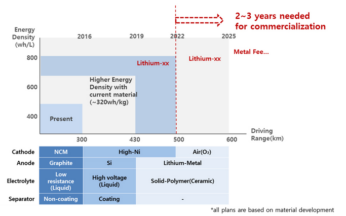 為了實(shí)現(xiàn)電動(dòng)車取代燃油車的目標(biāo),關(guān)鍵技術(shù)挑戰(zhàn)之一是長(zhǎng)續(xù)駛里程。如今,電池技術(shù)的研究熱點(diǎn)之一就是開發(fā)可以支持300-500km的電池技術(shù)。鋰離子電池的基礎(chǔ)概念首先在1985年由日本Asahi Chemical Industry(現(xiàn)為Asahi Kasei Corporation)的Akira Yoshino博士建立起來,并且在1991年由Sony Energy Tech實(shí)現(xiàn)商業(yè)化。在后續(xù)幾十年的IT行業(yè)發(fā)展過程中,鋰離子電池得到了廣泛的應(yīng)用和進(jìn)一步的發(fā)展進(jìn)步。如今電動(dòng)汽車的市場(chǎng)正在逐漸形成,這也促進(jìn)了動(dòng)力電池技術(shù)的逐步發(fā)展進(jìn)步。據(jù)預(yù)測(cè),2017年的移動(dòng)設(shè)備鋰離子電池需求量預(yù)測(cè)將達(dá)到50GWh,而動(dòng)力電池的需求量也大約為50GWh。如今,高能量的鋰離子電池能量密度可達(dá)到400-600Wh/L,可以支持300-400km左右的續(xù)駛里程,但是要支持500km以上的續(xù)駛里程,還需要進(jìn)一步開發(fā)高性能電池(例如,固態(tài)電池、鋰/金屬電池,金屬/空氣電池等)(圖6)。雖然在技術(shù)層面上已經(jīng)有了解決方案,但是這些技術(shù)方案是否能夠滿足OEM的成本和綜合性能要求,這還需要拭目以待。