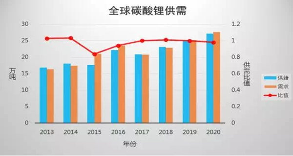 2017年,工業(yè)和信息化部、發(fā)展改革委、科技部共同印發(fā)《汽車產(chǎn)業(yè)中長(zhǎng)期發(fā)展規(guī)劃》中指出,到2020年,新能源汽車年產(chǎn)銷達(dá)到200萬(wàn)輛,到2025年我國(guó)新能源汽車銷量占總銷量的比例達(dá)到20%以上。通過(guò)折算,碳酸鋰當(dāng)量需要將增加30萬(wàn)噸,鈷金屬當(dāng)量增加10萬(wàn)噸。而去年全國(guó)碳酸鋰供銷為18-19萬(wàn)噸,這意味著不到10年時(shí)間碳酸鋰需求將增長(zhǎng)30萬(wàn)噸。