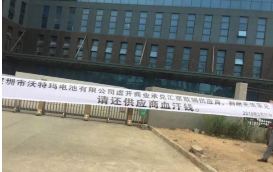 在深圳市坪山新區(qū)的工業(yè)園中,沃特瑪總部大樓屬于非常顯眼的建筑,高高懸掛在大樓上方的沃特瑪三個(gè)大字,宣告著它往日的輝煌。但是,在《中國(guó)汽車(chē)報(bào)》記者面前,緊緊關(guān)閉的伸縮門(mén)與筆直站立并不斷觀察周?chē)闆r的保安又讓人不得不面對(duì)現(xiàn)實(shí)。3月25日,供應(yīng)商正是圍堵這座大門(mén),并拉出“深圳市沃特瑪電池有限公司虛開(kāi)商業(yè)承兌匯票欺騙供應(yīng)商,到期無(wú)法承兌,請(qǐng)還供應(yīng)商血汗錢(qián)”的橫幅,場(chǎng)面堪稱混亂。
