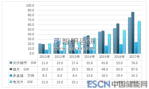 2011-2017年我國光伏產(chǎn)業(yè)主要產(chǎn)品產(chǎn)量統(tǒng)計(jì)