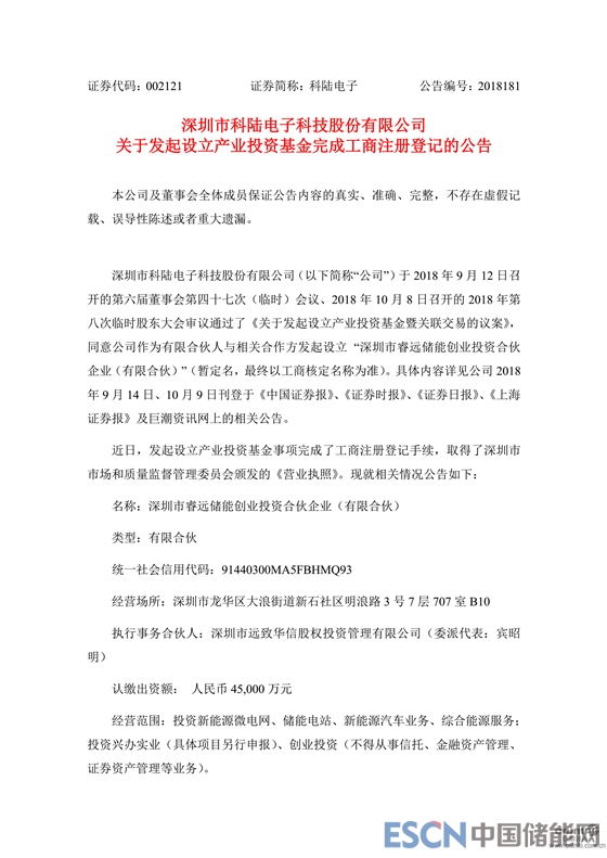 中國儲能網(wǎng)訊:10月15日,科陸電子發(fā)布公告稱,近日,公司發(fā)起設(shè)立的儲能投資基金事項(xiàng)完成了工商注冊登記手續(xù),取得了深圳市市場和質(zhì)量監(jiān)督管理委員會頒發(fā)的《營業(yè)執(zhí)照》,公司名稱為深圳市睿遠(yuǎn)儲能創(chuàng)業(yè)投資合伙企業(yè)(有限合伙),認(rèn)繳出資額4.5億元。