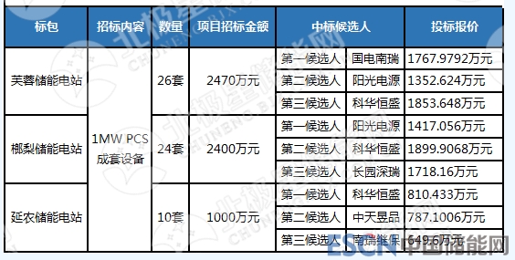 湖南長沙電池儲能電站一期示范工程儲能變流器PCS成套設(shè)備采購項目中標(biāo)候選人公示,國電南瑞南京控制系統(tǒng)有限公司、陽光電源股份有限公司、廈門科華恒盛股份有限公司分別為三個標(biāo)包的第一候選人,詳情如下: