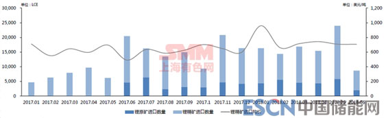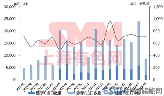 2017年1月至2018年6月中國(guó)鋰原料進(jìn)口:
