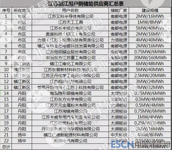 事實上,除了上述兩大市場外,江蘇省用戶側(cè)儲能市場這一特征更加明顯,據(jù)國網(wǎng)江蘇電科院高級工程師史明明介紹,江蘇省內(nèi)用戶側(cè)儲能主要供應(yīng)商為南都電源、太湖能谷、中天科技、力信能源,庫博能源。據(jù)統(tǒng)計,這5家企業(yè)儲能規(guī)模占全省用戶側(cè)儲能裝機容量的90%以上。下圖為江蘇鎮(zhèn)江用戶側(cè)儲能項目表。