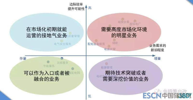 就商業(yè)模式來說,我們肯定覺得“新的需求+高邊際效率”的業(yè)務(右上角象限)是最有前途的,互聯(lián)網(wǎng)企業(yè)的打法也都是聚焦在這個象限。但是就電力行業(yè)來說,這個象限并不是所有的業(yè)務都馬上能落地的,原因是:電力或者能源行業(yè)并未如零售消費端那樣徹底市場化,其結果就是業(yè)務受政策影響很大,不確定性很高。比如儲能業(yè)務,可能工商業(yè)電價一下降,或者工商業(yè)可轉為兩部制電價的政策一落地,工商業(yè)儲能業(yè)務的短期風險就會快速增加。
