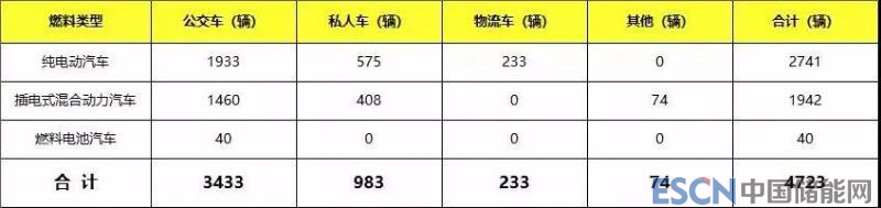 按燃料種類劃分,純電動汽車2741輛,占58%,插電式混合動力汽車1942輛,占41.2%,燃料電池汽車40輛,占0.8%。