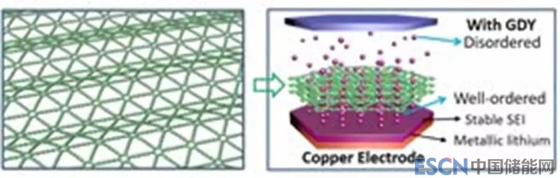 石墨炔結(jié)構(gòu)(左圖)及其在抑制鋰金屬電池中鋰枝晶生長的應(yīng)用(右圖)