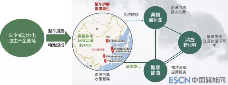 高度協(xié)同的梯次利用及再生產(chǎn)業(yè),包含收集網(wǎng)絡(luò)、梯次利用、梯次應(yīng)用、循環(huán)再生4個(gè)環(huán)節(jié),以整車報(bào)廢、電池退役為可服務(wù)對象,流程如下:
