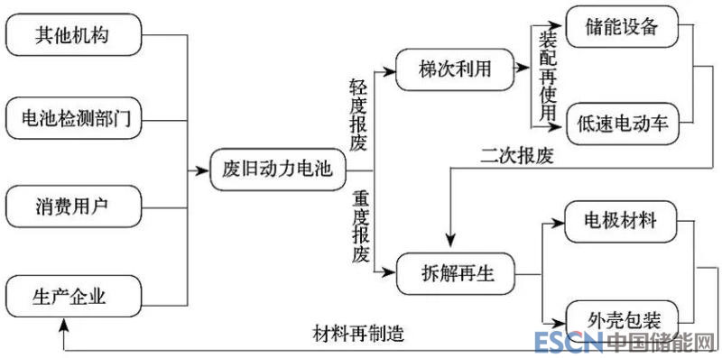 國內(nèi)動(dòng)力電池主要回收利用流程。在生產(chǎn)企業(yè)、消費(fèi)者、電池檢測部門及其他部門回收廢舊電池,根據(jù)輕度報(bào)廢和重度報(bào)廢,進(jìn)行梯次利用(在儲(chǔ)能設(shè)備和低速電動(dòng)車裝配再使用)和拆解再生。
