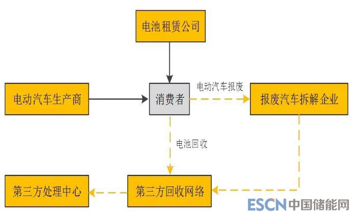 第三方為主體的動(dòng)力電池回收模式獲取電池的途徑主要有2個(gè),一是自建回收網(wǎng)絡(luò)和相關(guān)物流體系,負(fù)責(zé)回收委托企業(yè)售后市場生產(chǎn)的廢舊動(dòng)力電池,之后運(yùn)回回收處理中心,進(jìn)行專業(yè)化的回收處理;另一個(gè)是在電動(dòng)汽車最終報(bào)廢進(jìn)入汽車拆解企業(yè)后,汽車拆解企業(yè)可以將廢舊動(dòng)力電池銷售給第三方回收企業(yè)。