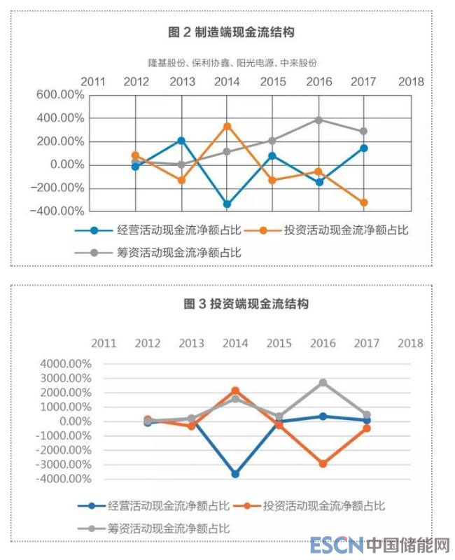 進(jìn)一步分析各企業(yè)的現(xiàn)金流結(jié)構(gòu),圖2和圖3所示分別為制造端與投資端企業(yè)的經(jīng)營、投資和籌資所獲現(xiàn)金流占比現(xiàn)金及現(xiàn)金等價(jià)物凈增加額情況(平均值);2012年歐美出臺(tái)雙反政策導(dǎo)致國外市場(chǎng)萎縮,全行業(yè)營收大幅下滑,經(jīng)營現(xiàn)金流不足,各公司的基本運(yùn)行主要通過籌資來維持,投資活動(dòng)減弱。2013年起得益于國內(nèi)光伏利好政策支持,2014和2016年投資端和制造端投資活動(dòng)積極,全產(chǎn)業(yè)呈現(xiàn)擴(kuò)張的態(tài)勢(shì)(圖2,圖3)。