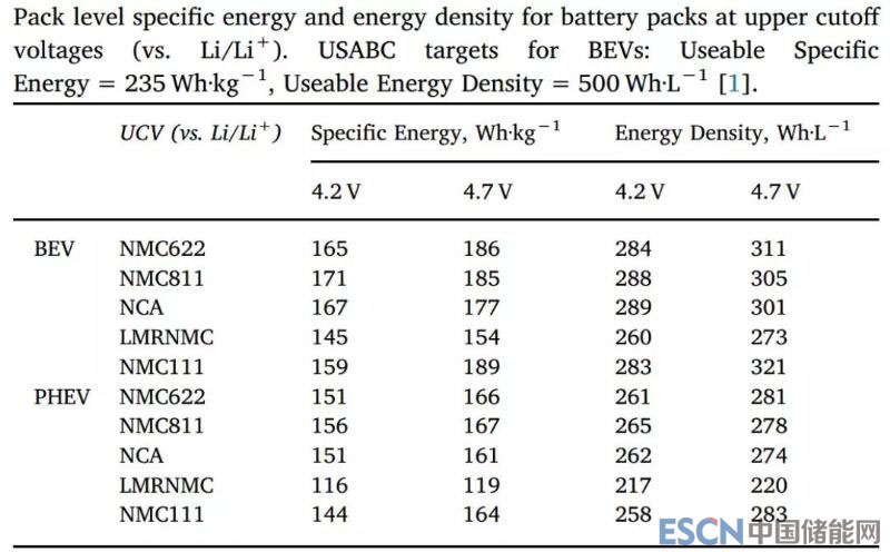 表5匯總了截止電壓分別為4.2V和4.7V時(shí),純電動(dòng)汽車(chē)和插電式混合動(dòng)力汽車(chē)電池pack的比能量和能量密度。
