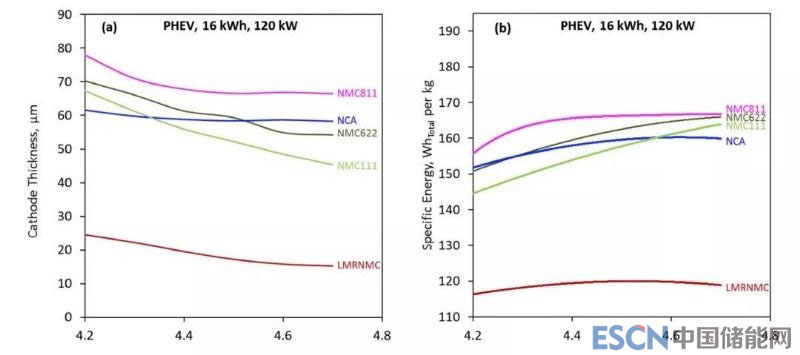 插電式混合動(dòng)力汽車(chē)電池要求高功率,假定電池包16kWh,10s脈沖功率要求120kW(7.5C),較高的功率要求進(jìn)一步限制了極片厚度,如圖6(a)所示,811的極片厚度也需要降至80微米。在這些極片厚度設(shè)計(jì)下對(duì)應(yīng)的PACK比能量如圖6(b)所示,在較高的截止電壓下,PACK的比能量由高到低排序?yàn)镹MC811 > NMC622 > NMC111 > NCA ? LMRNMC。