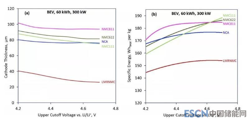 利用表3中50%SOC的電壓和第八次的放電容量,作者通過(guò)一系列的模擬推算預(yù)估在不同截止電壓下各材料的pack級(jí)別的能量密度。純電動(dòng)汽車(chē)電池要求高能量,假定電池包60kWh,10s脈沖功率要求300kW(5C),這樣的配置大概96S-3P,需要288個(gè)電池。在電池設(shè)計(jì)時(shí),提高極片厚度能夠提高正極活性物質(zhì)的占比,從而提高電池能量密度,但是功率特性下降。為了達(dá)到功率要求,作者先計(jì)算了極片的最大厚度,不同截止電壓下各材料的最大厚度如圖5(a)所示,在這些極片厚度設(shè)計(jì)下對(duì)應(yīng)的PACK比能量如圖5(b)所示。在這些材料中,同時(shí)滿(mǎn)足能量密度和功率要求,811能夠設(shè)計(jì)最大的極片厚度,約100微米,而富鋰材料的極片厚度最低。截止電壓4.7V時(shí),PACK的比能量由高到低排序?yàn)镹MC111 > NMC622 >NMC811 > NCA ? LMRNMC,當(dāng)截止電壓為 4.4 V 時(shí),排序?yàn)镹MC811 > NMC622 > NCA >NMC111 ? LMRNMC。表3所示,富鋰材料高的直流內(nèi)阻限制了極片厚度的提升,從而能量密度表現(xiàn)沒(méi)有優(yōu)勢(shì)。