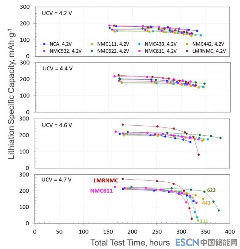 其中,富鋰錳基,高鎳三元,鎳鈷鋁等正極成為開(kāi)發(fā)高能量密度的首選正極材料,而且配合高壓電解液提高電池的充電截止電壓,從而提高電池能量密度。富鋰、NCA、811、622、532、442、433、111這些正極材料在不同截止電壓下性能到底如何呢?