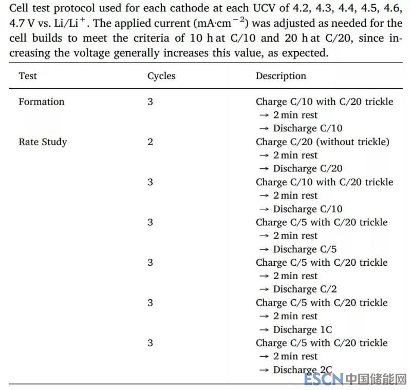 美國(guó)阿貢實(shí)驗(yàn)室Ahmed專(zhuān)門(mén)對(duì)比研究了這些材料,各種正極材料做成的極片具體信息如表1所示,漿料配方和極片設(shè)計(jì)沒(méi)有優(yōu)化,然后把這些極片組裝成紐扣半電池,電解液為EC:EMC=3:7,1.2m LiPF6,無(wú)任何其他添加劑和溶劑。電池下截止電壓除了富鋰材料為2.5V,其他均為3.0V,分別對(duì)比了上截止電壓4.2,4.3,4.4,4.5,4.6,4.7V的各種性能,在每個(gè)截止電壓下電池進(jìn)行表2所示的充放電循環(huán),共20個(gè)循環(huán)。