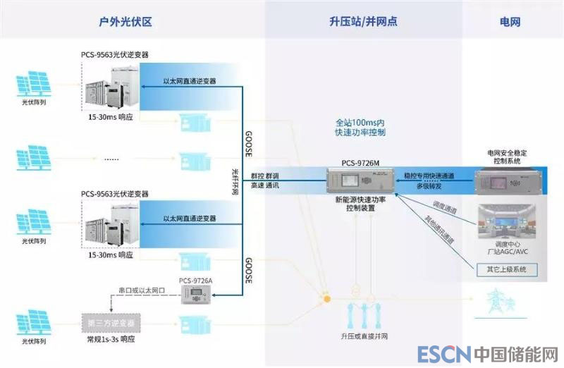 南瑞繼保針對現(xiàn)有新能源大規(guī)模接入電網(wǎng)對光伏電站參與電網(wǎng)暫態(tài)穩(wěn)定調(diào)節(jié)的需要,提出并研制了由新能源快速功率控制裝置、光伏逆變器和快速通信接口裝置(選配)構成的PCS光伏電站快速功率控制系統(tǒng)。該系統(tǒng)實現(xiàn)了全站100ms內(nèi)的快速功率響應,支持了穩(wěn)控系統(tǒng)對光伏電站的“以調(diào)代切”和“升降雙向”控制,使光伏電站具備廠站級百毫秒級快速調(diào)頻、調(diào)壓功能。該系統(tǒng)提高了電網(wǎng)運行的靈活性、可靠性與經(jīng)濟性,大大提高了新能源消納能力。