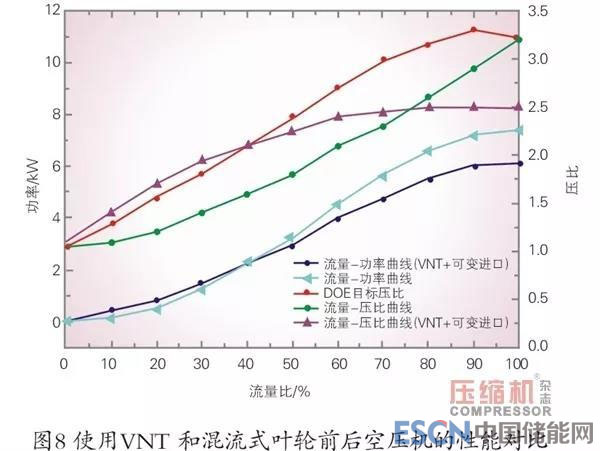 混流式空壓機(jī)葉輪和可變渦輪進(jìn)口導(dǎo)葉(VNT)是改善空氣供應(yīng)系統(tǒng)的流量/壓比特性和功率特性的有效方式,如圖8所示。