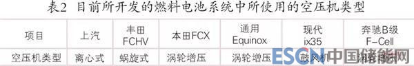 離心式壓縮機(jī)在密度、效率、噪聲等方面具有最好的綜合效果,被認(rèn)為是最有前途的空氣增壓方式之一。表 2為目前所開發(fā)的燃料電池系統(tǒng)中所使用的空壓機(jī)類型。