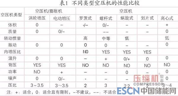 通過比較可以看出渦旋式、螺桿式和離心式空壓機(jī)的綜合性能較好。但渦旋式和螺桿式空壓機(jī)的葉片間存在相互摩擦,噪聲和質(zhì)量較大,且難以與渦輪匹配工作,無法回收排氣能量,目前只有通過渦輪與離心式壓縮機(jī)匹配來實(shí)現(xiàn)。