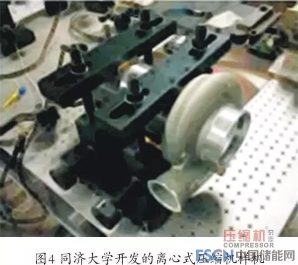 設(shè)計(jì)參數(shù)如下:最大空氣流量:80g/s;壓比:1.5~2.5;潤滑:水潤滑方式;系統(tǒng)功耗:<10kW。圖4為同濟(jì)大學(xué)開發(fā)的離心式壓縮機(jī)樣機(jī)。