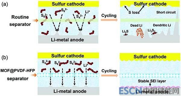 中國(guó)儲(chǔ)能網(wǎng)訊:鋰硫電池因其超高的超高的理論能量密度(≈2600Wh kg -1)被廣泛地認(rèn)為是未來(lái)大規(guī)模儲(chǔ)能領(lǐng)域應(yīng)用發(fā)展的方向。然而,Li枝晶的生長(zhǎng)和多硫化物的穿梭效應(yīng)嚴(yán)重阻礙了它們的實(shí)際應(yīng)用。Li的不均勻電沉積導(dǎo)致Li枝晶生長(zhǎng)是鋰二次電池中的典型問(wèn)題,其將產(chǎn)生一系列的不良影響,包括副反應(yīng)增加,枝晶中死Li的演變,極化增加和體積變化。更糟糕的是,Li枝晶的持續(xù)生長(zhǎng)最終會(huì)刺穿隔膜,從而導(dǎo)致內(nèi)部短路和安全隱患。多硫化物穿梭是Li-S電池中的常見(jiàn)現(xiàn)象。具體而言,由硫正極產(chǎn)生的可溶性中間體多硫化物可以通過(guò)隔膜到達(dá)鋰負(fù)極并與鋰金屬反應(yīng),在陽(yáng)極表面形成不溶的Li2S和Li2S2,導(dǎo)致Li金屬陽(yáng)極表面鈍化和活性硫的損失。已經(jīng)開(kāi)發(fā)了許多策略致力于解決上述問(wèn)題。其中隔膜改性一個(gè)很有前景的方案,因?yàn)楦裟な请姵刂胁豢苫蛉钡牟考k姵馗裟げ粌H可以作為電子絕緣體,防止兩個(gè)電極直接接觸,還可以控制載體離子的傳輸。因此,開(kāi)發(fā)具有抑制鋰枝晶和多硫化物穿梭的隔膜對(duì)于實(shí)現(xiàn)高能量密度,長(zhǎng)穩(wěn)定循環(huán)的鋰硫電池十分重要的。