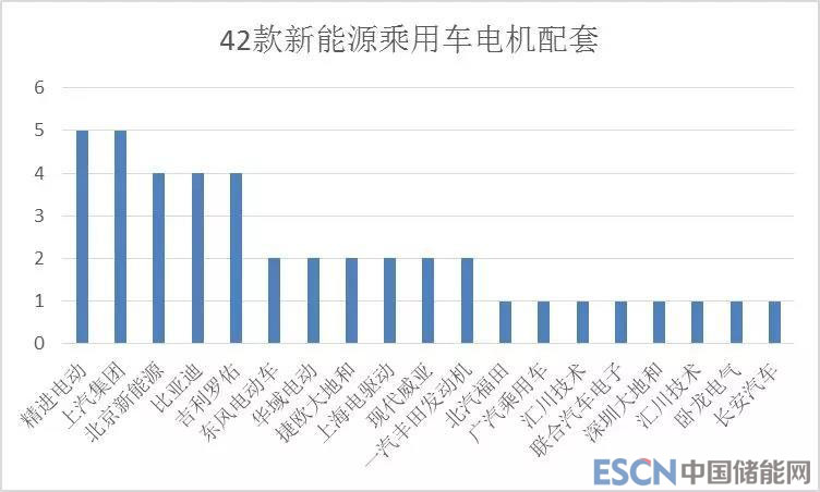 從電機(jī)配套來看,42款新能源車電機(jī)配套企業(yè)來自19家企業(yè),精進(jìn)電動(dòng)(5款)、上汽集團(tuán)(5款)、北京新能源(4款)、比亞迪(4款)、吉利羅佑(4款)入選數(shù)量最多。