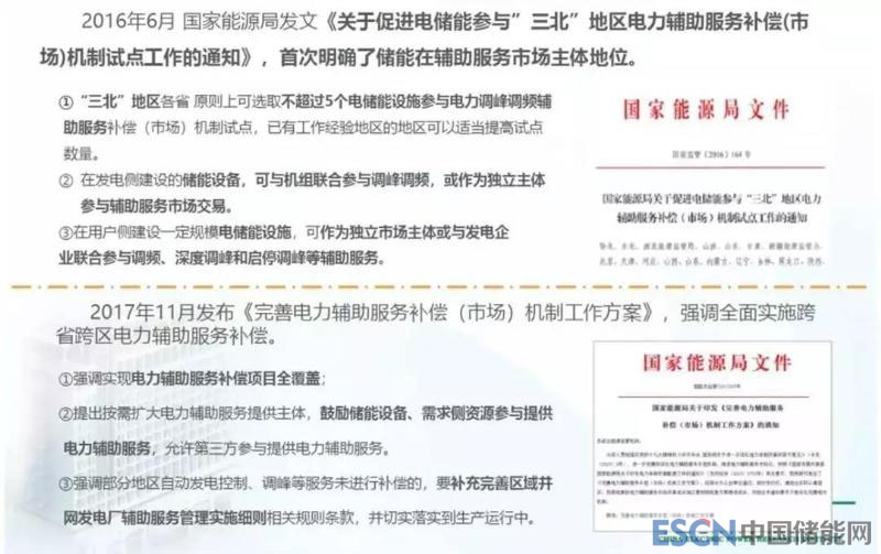 宏觀層面,國家在2016年和2017年分別出臺了兩個文件,分別為《關于促進電儲能參與“三北”地區(qū)電力輔助服務補償(市場)機制試點工作的通知》和《完善電力輔助服務補償(市場)機制工作方案》,明確了儲能在輔助服務市場的主體地位,全面實施跨省跨區(qū)電力輔助服務補償。