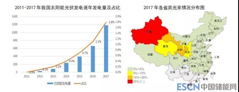 背景7:2017年全國太陽能光伏發(fā)電量1182億千瓦時,同比增長75.4%。太陽能光伏發(fā)電量占總發(fā)電量的比例達(dá)到1.8%,光伏發(fā)電消納形勢明顯改善,棄光量、棄光率均有所下降,但棄光量依然達(dá)到67.4億千萬時,棄光率達(dá)到6.3%。2018年前三季度,棄光電量40億千瓦時,同比減少11.3億千瓦時,棄光率3%,同比下降2.7個百分點(diǎn)。雖然光伏發(fā)電棄電量和棄光率均有所改善,但局部地區(qū)消納矛盾仍普遍存在。