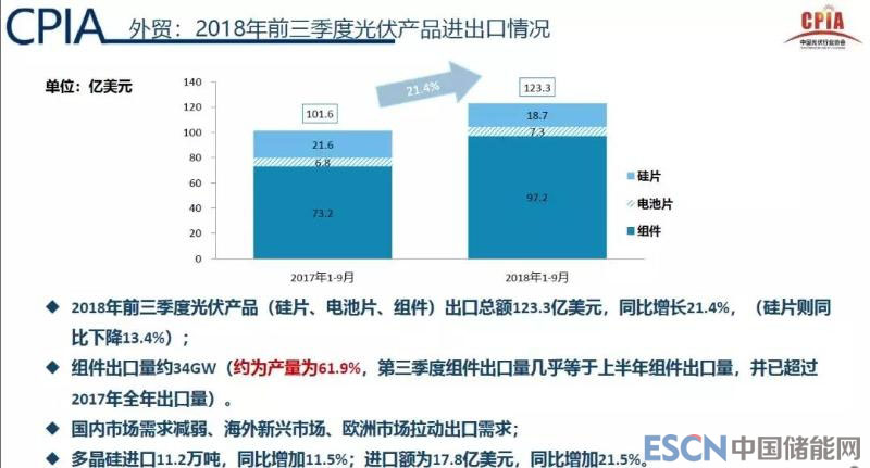 背景5:進(jìn)入2018年以來,國際貿(mào)易形勢迎來了一些新的變化,從2018年1-9月光伏產(chǎn)品(硅片、電池片、組件)出口情況來看,繼續(xù)保持增長態(tài)勢,總額121.3億美元,同比增長19.4%;其中,組件出口量約34GW,約為產(chǎn)量的61.9%,已超過2017年全年出口量。這主要得益于,南美、中東北非等新興市場以及歐洲市場需求增長的拉動。中歐光伏產(chǎn)品貿(mào)易爭端消除,一大批企業(yè)轉(zhuǎn)戰(zhàn)歐洲光伏市場;中美貿(mào)易爭端,我國光伏產(chǎn)品出口美國市場受阻。