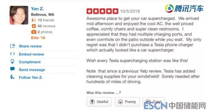 在美國(guó)版大眾點(diǎn)評(píng)Yelp的評(píng)價(jià)當(dāng)中,凱特爾曼城超級(jí)充電站獲得了一邊倒的五星好評(píng),唯一的抱怨是:休息室里給小孩子設(shè)計(jì)的玩具能不能裝的再低一點(diǎn)?